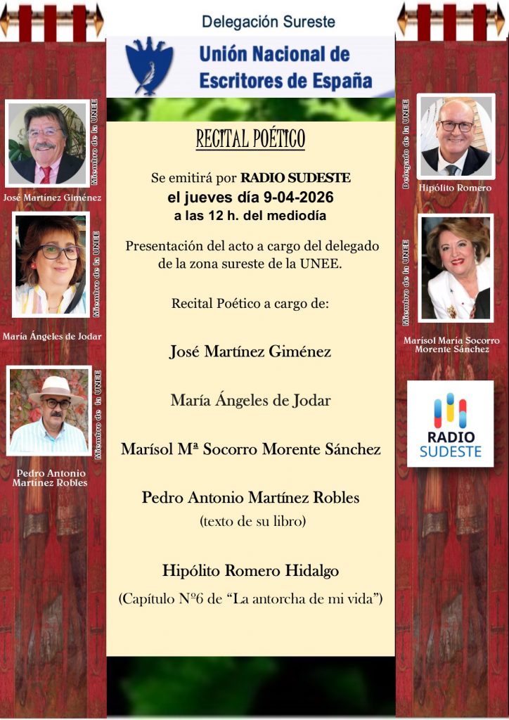 Día 9-04-2026 LA NOCHE TEMÁTICA. Desde las 23:30 h. del miércoles día 8 de abril hasta la madrugada del jueves día 9 podréis escuchar en directo el Foro Poético de la Región de Murcia, dirige Hipólito Romero Hidalgo. Publicado elabril 4, 2026abril 4, 2026AutorHipólito Romero